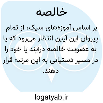• هرگز نباید زنا کنی. فرد پذیرفته شده باید همواره نمادهای فیزیکی خالصه را بپوشد و دستورالعمل رفتاری آن را اجرا کند.