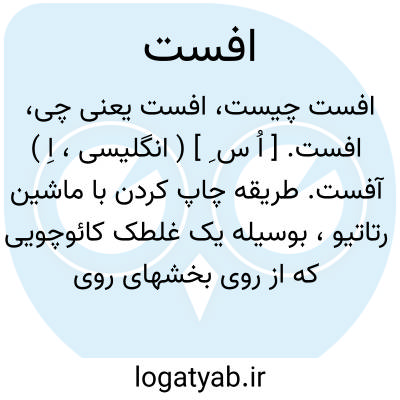 ( آفست ) ( اسم ) طریق. چاپ کردن با ماشین رتاتیو بوسیل. یک غلطک کائوچوکی که از روی بخشهای رویین مرکبی عبور میکند و بدین ترتیب مرکب بکاغذ نقل میشود افست.