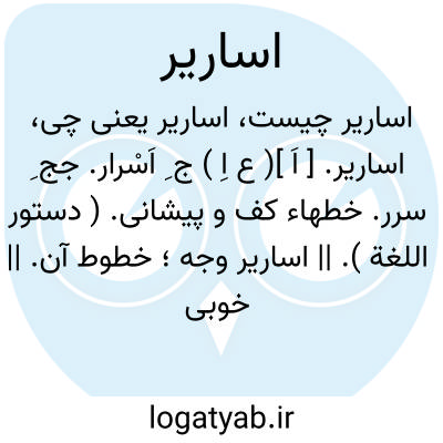 اساریر. [ اَ ]( ع اِ ) ج ِ اَسْرار. جج ِ سرر. خطهاء کف و پیشانی. ( دستور اللغة ). || اساریر وجه؛ خطوط آن. || خوبی روی و هر دو رخسار. ( منتهی الارب ).