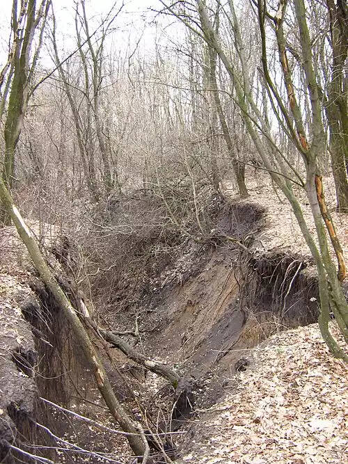 جایی که رود یا سیل خاکش را برده باشد. آبگیر. گودال.