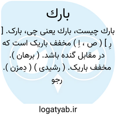 بارک. [ رِ ] ( ص، اِ ) مخفف باریک است که در مقابل گنده باشد. ( برهان ). مخفف باریک. ( رشیدی ) ( دِمزن ). رجوع به بارکک شود.( فرهنگ اسدی چ عباس اقبال ص 297 ). ( مخفف باریک ) چیز نازک و آن که کلفت نباشد. ( فرهنگ نظام ):