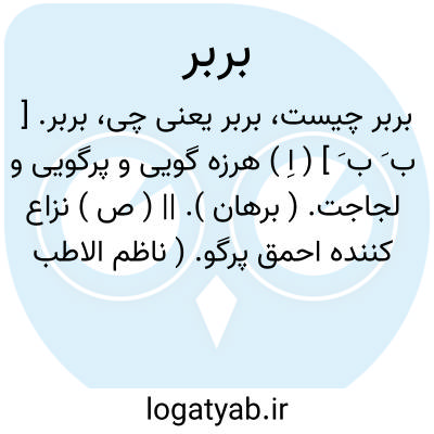 بربر. [ ب َ ب َ ] ( اِ ) هرزه گویی و پرگویی و لجاجت. ( برهان ). || ( ص ) نزاع کننده احمق پرگو. ( ناظم الاطباء ).