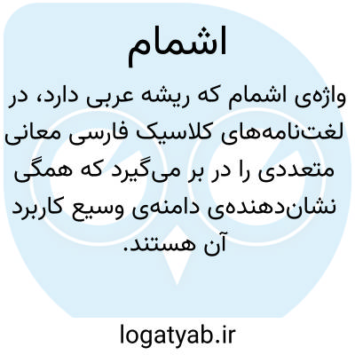 واژه‌ی اِشمام که ریشه عربی دارد، در لغت‌نامه‌های کلاسیک فارسی معانی متعددی را در بر می‌گیرد که همگی نشان‌دهنده‌ی دامنه‌ی وسیع کاربرد آن هستند. معنای اصلی و رایج آن در اصل، بوییدن است؛ یعنی عمل استشمام کردن و درک بو، به‌ویژه بوی خوش. همچنین در معنای مقابل، یعنی بویانیدن یا معطر ساختن نیز به کار رفته است. این دوگانگی معنایی در ریشه، نشان می‌دهد که این فعل به هر دو حالت انفعالی (دریافت بو) و فعالی (ایجاد بو) اشاره داشته است.