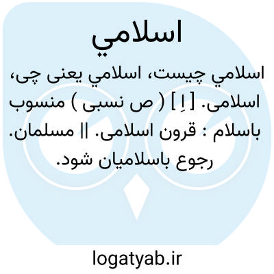 ( صفت ) ۱ - منسوب به اسلام آنچه از تمدن و فرهنگ و جز آن که منسوب به اسلام باشد. ۲ - پیرو اسلام مسلمان. جمع: اسلامیان. یا دور. اسلامی عهد اسلامی. دور. بعد از اسلام. یا قرون اسلامی. قرنهایی که از آغاز اسلام ببعد سپزی شده است.