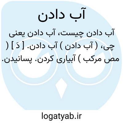 ( آب دادن ) ( مصدر ) ۱ - اعطای آب بکسی یا حیوانی: ( یک لیوان آب بمن داد. ) ۲ - آب ریختن جاری کردن آب با آب پاش و مانند آن آبیاری کردن: ( باغچه را آب دادم. ) یا آب دادن بزهر. آلودن شمشیر و خنجر و جز آن بزهر تا التیام نپذیرد. یا آب دادن چشم. جاری شدن آب مخصوص از دیدگان بعلت کسالت و پیری. یا آب دادن فلز. طلی کردن آن بفلز گرانبهاتر آب زر یا سیم دادن. یا آب دادن کارد و شمشیر و مانند آن عملی که شمشیر سازان و کارد گران کنند برای سخت کردن آهن و آن فرو بردن فلز تفت. شمشیر و مانند آن است در آب.
