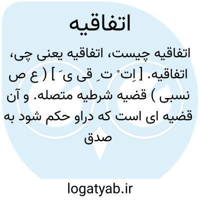 ( صفت ) ۱ - موئ نث اتفاقی. ۲ - قضی. شرطی. متصله و آن قضیهایست که در او حکم شود بصدق تالی بر فرض صدق مقدم و علاقه بین آنها موجود نیست بلکه بمجرد صدق آن دو این قضیه اتفاق میافتد مثلا: اگر انسان سخنگوست پس خر عرعر کننده است. بعضی گفته اند اتفاقیه فقط عبارتست از صدق تالی خواه مقدم راست باشد یا دروغ و اینرا اتفاقی. عامه و اولی را اتفاقی. خاصه گویند و میان آن دو ( از نسب ) عموم و خصوص است زیرا هر وقت مقدم راست آمد تالی راست است و عکس آن درست نیست.