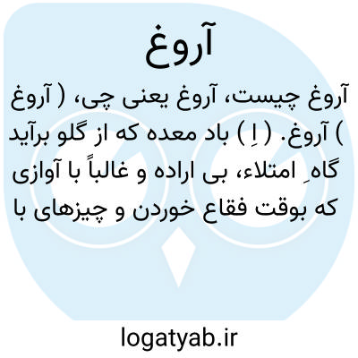 ( آروغ ) آروغ. ( اِ ) باد معده که از گلو برآید گاه ِ امتلاء، بی اراده و غالباً با آوازی که بوقت فقاع خوردن و چیزهای باد و دم دار مردم را افتد و آن تنفس معده باشد از راه گلو. زراغن. گوارش. باد گلو.آجل. رجک. جشاء. آرغ. زروغ. روغ. وروغ: