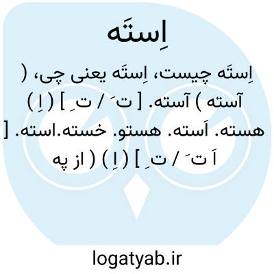 استه. [ اَ ت َه ْ ] ( ع ص ) بزرگ دبر. کلان سرین. عظیم الاست. مؤنث: سَتْهاء. ( منتهی الارب ). ج سُتْه، سُتهان.