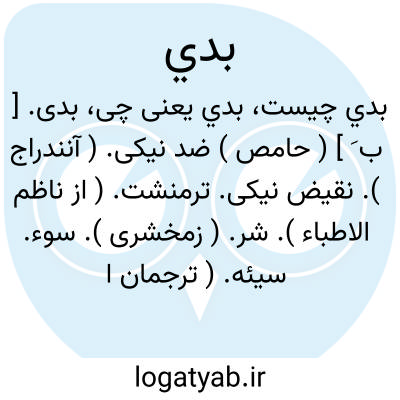 بدی. [ ب َ ] ( حامص ) ضد نیکی. ( آنندراج ). نقیض نیکی. ترمنشت. ( از ناظم الاطباء ). شر. ( زمخشری ). سوء. سیئه. ( ترجمان القرآن جرجانی ترتیب عادل بن علی ). شرة. ( دهار ). اِرب. بُجر. تَعس. جفا. جفوة. خَل. خَنابة. دَوکَة. دَهم. رَباذیة.رَهَق. طَبَندَر. عاثور. عاذور. عَثار. غائلة. غَندَرَة. مَحل. مَعالَة. مَعَرَّة. مَعکوکاء. مَقمور. منایرة. نُصُب. نُصب. نَطَف. نَیرَب. وَشیمَه. ( منتهی الارب ). سوء. ساءَة. خَبَث. اسائة. ردائت. قباحت. داهیة. مقابل نیکی، حسنه. ( یادداشت مؤلف ):