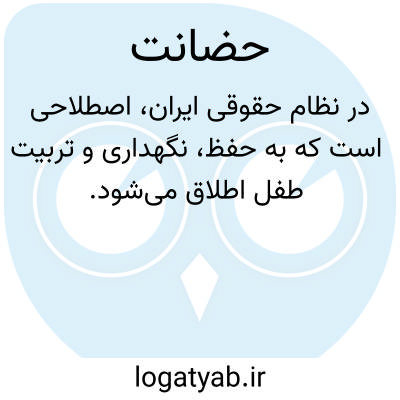 در نظام حقوقی ایران، اصطلاحی است که به حفظ، نگهداری و تربیت طفل اطلاق می‌شود. این مفهوم، همان‌گونه که از معنای لغوی آن برمی‌آید، بر عهده‌داری مسئولیت سرپرستی و پرورش کودک دلالت دارد و در تعاریف فقهی نیز جدای از این ریشه نیست. فقهای امامیه با تأکید بر ابعاد گستردهٔ این مسئولیت، حضانت را «ولایت و سلطنت بر تربیت طفل و امور مرتبط با آن» تعریف نموده‌اند. این امور شامل نگهداری مستقیم، تنظیم خواب، بهداشت فردی، پاکیزه‌نگه‌داشتن کودک و دیگر نیازهای اولیهٔ وی می‌گردد.