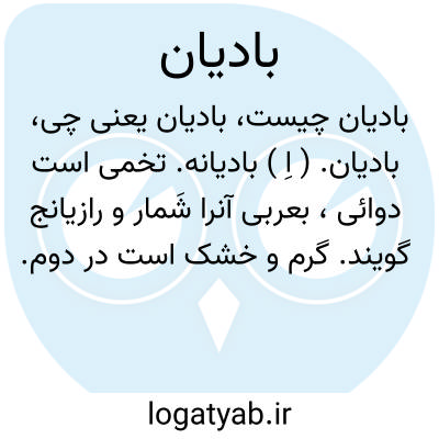 بادیان. ( اِ ) بادیانه. تخمی است دوائی، بعربی آنرا شَمار و رازیانج گویند. گرم و خشک است در دوم. ( آنندراج ). تخم نباتی است بلندتر از زرعی، ساقش مربع و برگش باریک و خوشبو و گلش مایل بسپیدی و آن را انیسون گویند. مصلح ضرر چائی ختائی است که استعمال و شرب آن متداول شده. ( انجمن آرا ). گیاه معطری از طایفه چتریان که رازیانه نیز گویند. ( ناظم الاطباء ). و رجوع به شعوری ج 1 ورق 180 شود. رازیانج. ( محمودبن عمر ربنجنی ) ( بحر الجواهر ). بادتخم. وادیان. ( شعوری از اختیارات ). رازیانه. ( محمودبن عمر ربنجنی ) ( بحر الجواهر ). چارتخم: