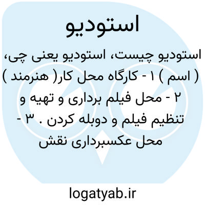 ( اسم ) ۱ - کارگاه محل کار( هنرمند ) ۲ - محل فیلم برداری و تهیه و تنظیم فیلم و دوبله کردن. ۳ - محل عکسبرداری نقشه کشی و جز آن.
