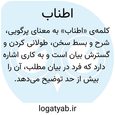 کلمه‌ی «اطناب» در فارسی و عربی به معنای پرگویی، شرح و بسط سخن، طولانی کردن و گسترش بیان است. این واژه جمع «طنب» است و به کاری اشاره دارد که فرد در بیان مطلب، آن را بیش از حد توضیح می‌دهد یا سخن را به گونه‌ای گسترده و مفصل مطرح می‌کند. در ادبیات و متون کلاسیک، «اطناب» گاهی برای نشان دادن سخن دقیق و با جزئیات، ولی گاهی نیز به صورت منفی برای پرگویی و طولانی‌کردن بی‌مورد به کار می‌رود. نویسندگان و شاعران گاهی این روش را برای روشن‌کردن مطلب، توصیف دقیق یا تاکید بر نکته‌ای به کار می‌برند، اما در برخی موارد، اطناب می‌تواند موجب خستگی مخاطب شود و از وضوح سخن بکاهد. در متون دینی و ادبی، اطناب گاهی به معنای گسترش و تعمق در بیان معانی و مفاهیم آمده است تا پیام بهتر منتقل شود. هم‌معنی‌های آن عبارت‌اند از بسط سخن، شرح مفصل، طولانی کردن، تفصیل و پرگویی.