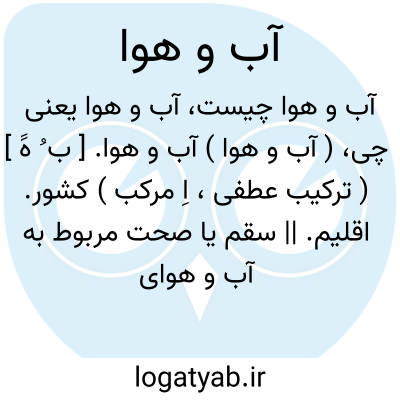 ( آب و هوا ) آب و هوا. [ ب ُ هََ ] ( ترکیب عطفی، اِ مرکب ) کشور. اقلیم. || سقم یا صحت مربوط به آب و هوای ناحیتی.