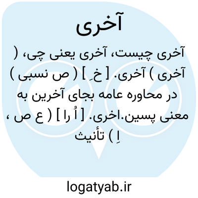( صفت ) ۱ - دیگر دگر پسین دومین مقابل اولی ٠ جمع: اخریات اخر ۲ ٠ - آن جهان آن سرای جهان دیگر آخرت عقبی مقابل دنیا ٠ یا بعبارت اخری ٠ بعبارت دیگر بدیگر سخن ٠
