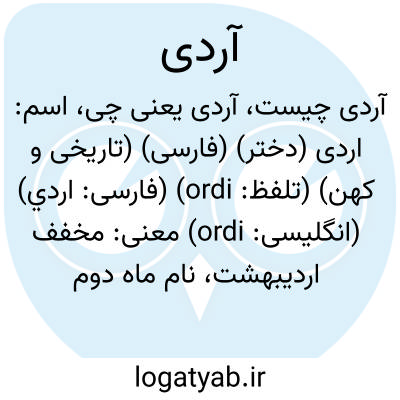 معنی: مخفف اردیبهشت، نام ماه دوم سال شمسی، ( اَعلام ) ) فرشته ی مدَبِر کوه ها، ) ( در قدیم ) در فرهنگ ایران قدیم فرشته ای که نماینده ی پاکی است و نگهبانی آتش با اوست