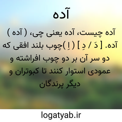 ( آده ) آده. [ دَ / دِ ] ( اِ )چوب بلند افقی که دو سر آن بر دو چوب افراشته و عمودی استوار کنند تا کبوتران و دیگر پرندگان بر آن نشینند. و آن را اَده بفتح همزه نیز گویند: