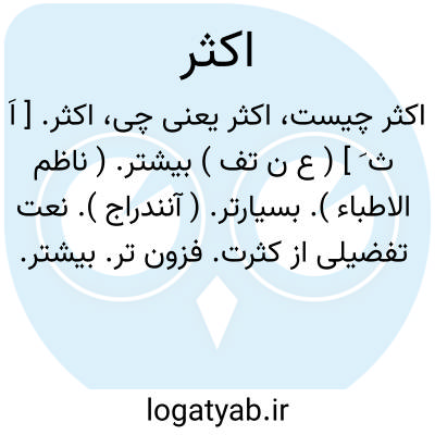 ( صفت ) ۱ - بیشتر. ۲ - بسیار. ۳ - اغلب. یا اکثر اوقات. غالب اوقات. یا حد اکثر. آخرین حد.(اکثرا ) غالبا بیشتر: (تعالی صیغ. ماضی معلوم از باب تفاعل بمعنی بلند شد و اکثرا اسم الهی را حال واقع شود چون خدای تعالی و حق تعالی... ) (غیاث ) توضیح اکثرا با تنوین صحیح نیست بجای آن در عربی (غالبا ) و در فارسی (بیشتر ) استعمال شود.