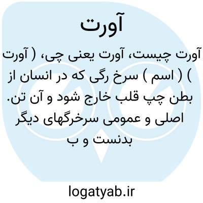 ( آورت ) ( اسم ) سرخ رگی که در انسان از بطن چپ قلب خارج شود و آن تن. اصلی و عمومی سرخرگهای دیگر بدنست و بدو قسمت سینه یی و شکمی تقسیم گردد و خون روشن ( اکسیژن دار ) در آن جاریاست بزرگ سرخ رگ بدن ام الشرائین آورت آورطی ارطی. فرهنگستان این کلمه را در برابر انتخاب کرده است.