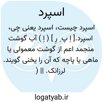 اسپرد.[ اِ پ ِ رِ ] ( اِ ) آب گوشت منجمد اعم از گوشت معمولی یا ماهی یا پاچه که آن را یخنی گویند. لرزانک. || ( ص ) متحیر. ( ناظم الاطباء ) ( شعوری ). || منجمد. || بستنی. ( ناظم الاطباء ).