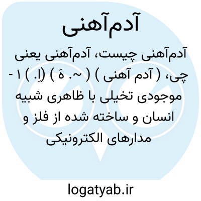 ( آدم آهنی ) ( ~. هَ ) (اِ. ) ۱ - موجودی تخیلی با ظاهری شبیه انسان و ساخته شده از فلز و مدارهای الکترونیکی که در فیلم های سینمایی بسیاری از کارهای انسان را انجام می دهد. ۲ - مجازاً به کسی که از خود اختیاری ندارد و طبق گفتة دیگران عمل می کند اطلاق می شود.