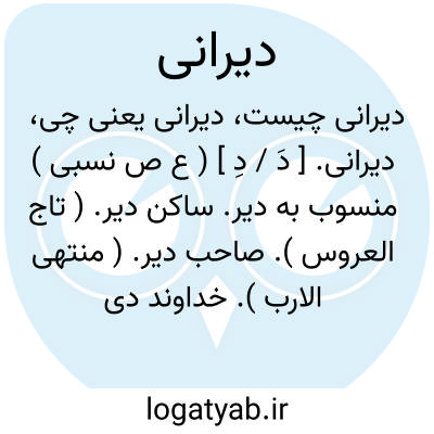 دیرانی. [ دَ / دِ ] ( ع ص نسبی ) منسوب به دیر. ساکن دیر. ( تاج العروس ). صاحب دیر. ( منتهی الارب ). خداوند دیر. ( مهذب الاسماء ). راهب. دیرنشین. ( یادداشت مؤلف ):