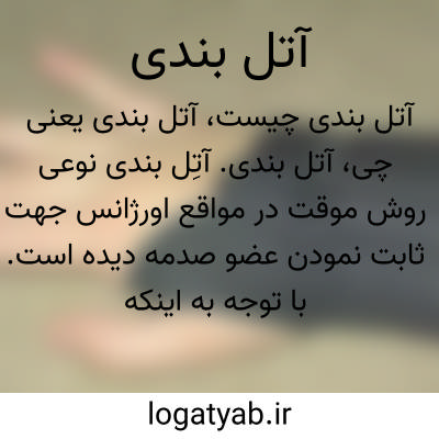 آتل بندی. آتِل بندی نوعی روش موقت در مواقع اورژانس جهت ثابت نمودن عضو صدمه دیده است. با توجه به اینکه در مواردی مانند شکستگی استخوان، دررفتگی یا ضرب دیدگی، حرکت عضو آسیب دیده موجب افزایش احتمالی آسیب ها می گردد بی حرکت نمودن آن ضروری است. در بیمارستان برای بیحرکت نمودن اغلب از روش گچ گیری یا جراحی و تثبیت قطعات شکسته استخوان با گذاشتن فیکساتور ( پلاتین ) استفاده می کنند ولی در موارد فوریت های پزشکی می توان با قراردادن دو جسم ثابت مانند دوقطعه چوب یا لوازم مشابه در اطراف بافت آسیب دیده و پیچیدن باند یا پارچه به دور آن اینکار را انجام داد. به این روش آتل بندی می گویند.