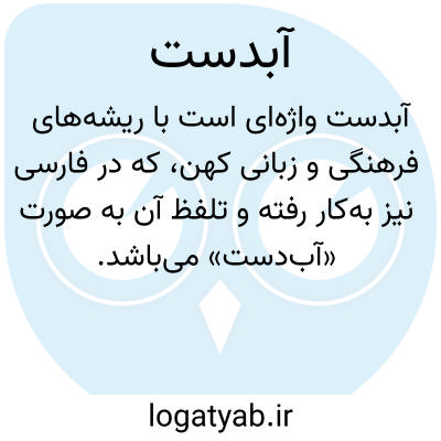 ( آبدست ) ( اسم ) ۱ - زاهد پاکدامن. ۲ - کسی که دست او در کار چیرگی کند سخت چابک ماهر استاد ( آبدستی ). ۳ - مستراح مبرز جایی. ۴ - قسمی جامه لباده جب. آستین کوتاه. ۵ - قسمت فوقانی سر آستین دراز تر از قسمت تحتانی آنکه بر روی آستین برگردانند برای زینت سنبوسه.