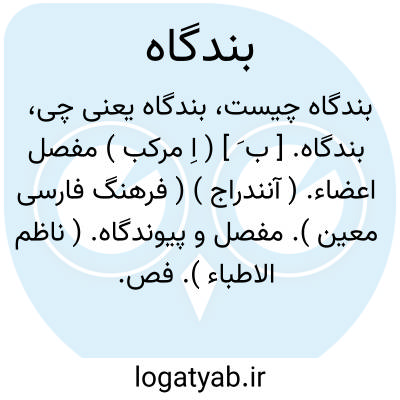 بندگاه. [ ب َ ] ( اِ مرکب ) مفصل اعضاء. ( آنندراج ) ( فرهنگ فارسی معین ). مفصل و پیوندگاه. ( ناظم الاطباء ). فص. ( دهار ). وصل. مفصل: دردهای تهیگاه و دردهای بندگاه عرق النساء بلغمی را خوردن و ضماد کردن نافع بود. ( ذخیره خوارزمشاهی،از یادداشت مؤلف ). و بر سر زانو که بندگاه ران است با ساق یک پاره استخوان است، آنرا الرصفه گویند و بپارسی گردنای زانو گویند. ( ذخیره خوارزمشاهی ایضاً ). آرنج. بندگاه دست بود میان ساعد بازو. ( فرهنگ اسدی نخجوانی ). || دره، زیرا که آن موضعی است که در آن برای سد راه مترددین و مسافرین بندی توان کرد و مزاحمت رسانیده و با مردم قلیل مانع فوج کثیر شد. ( آنندراج ). دره. ( فرهنگ فارسی معین ):