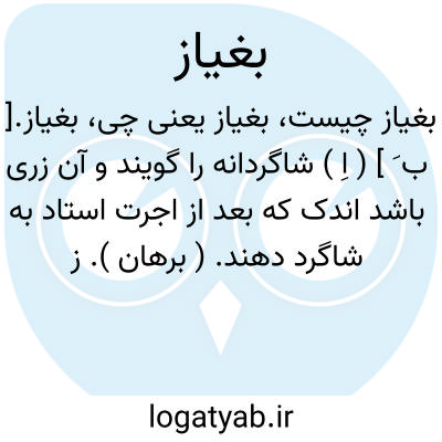 بغیاز.[ ب َ ] ( اِ ) شاگردانه را گویند و آن زری باشد اندک که بعد از اجرت استاد به شاگرد دهند. ( برهان ). زری که استاد به شاگرد در عوض کار دهد شاگردانه نیز گویند، مرادف فغیاز. ( رشیدی ) ( از جهانگیری ). شاگردانه یعنی پول اندکی که علاوه بر اجرت استاد بشاگرد دهند. ( ناظم الاطباء ). شاگردانه. ( سروری ). عطا و شاگردانه باشد. ( لغت فرس اسدی ). نودارانی و شاگردانه باشد و آن چیزی نقد باشد که بعد از اجرت استاد بشاگرد دهند و آن بمنزله بهای شیرینی آن جامه نو است که صاحبش پوشد. ( آنندراج ) ( انجمن آرا ). شاگردانه یعنی پولی که مشتری بعد از خریدن مال بشاگرددکان دهد یا پولی که استاد و صاحب دکان بعد از فروختن مال به شاگرد خود دهد. ( فرهنگ نظام ):