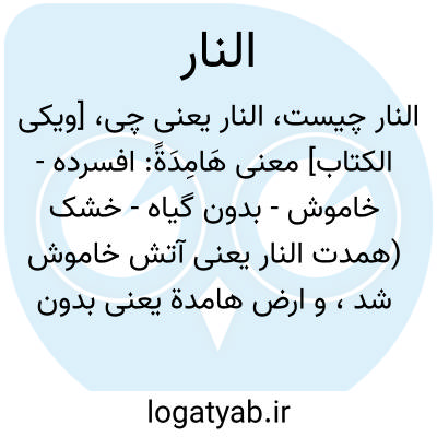 آتش.. راغب گوید: به قول بعضی نارونور از یک اصل اند و بیشتر متلازم هم می‏باشند و نیز گوید: نار به شعله محسوس، و حرارت و نار جهنم و نار حرب گفته می‏شود.. لفظ «نار» مونث مجازی است گاهی مذکر نیز آید (اقرب الموارد) به قول طبرسی اصل نار از نور است.