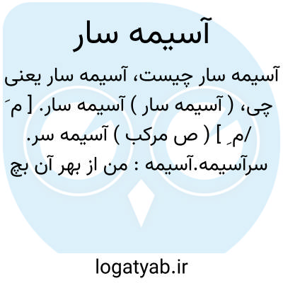 ( آسیمه سار ) ( صفت ) ۱ - مضطرب پریشان مشوش آشفته. ۲ - حیران حیرت زده متحیر سرگشته. ۳ - متعجب بشگفتی مانده. ۴ - دهشت زده هراسیده بیمناک. ۵ - ژولیده نابسامان. ۶ - شتابزده.