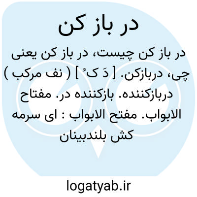 دربازکن. [ دَ ک ُ ] ( نف مرکب ) دربازکننده. بازکننده در. مفتاح الابواب. مفتح الابواب: ای سرمه کش بلندبینان دربازکن درون نشینان.نظامی.|| ( اِ مرکب ) امروز بر یک نوع وسیله الکتریکی اطلاق می شود که بوسیله آن در خانه را می توان از داخل ساختمان باز نمود. || آلت و وسیله گشادن در بطری؛ چوب پنبه کش یکی از انواع آنست.