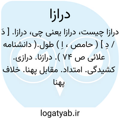 درازا. [ دَ / دِ ] ( حامص، اِ ) طول.( دانشنامه علائی ص 74 ). درازنا. درازی. کشیدگی. امتداد. مقابل پهنا. خلاف پهنا. بَلخ. درازنای. ( انجمن آرا ). به معنی درازی است چنانکه فراخا به معنی فراخی. ( آنندراج ). یکی از بعدهای سه گانه است و دو بعد دیگر پهنا و ژرفاست یا عرض و عمق. درازترین بعد هر سطح در مقابل عرض یا پهنا که کوتاهترین بعد آن است: درازای مزگت خانه خدای عزوجل سیصدوهفتاد ارش است. ( حدود العالم ). خانه مکه را بیست وچهار ارش و نیم درازاست. ( حدود العالم ). و درازای وی [ ناحیت شکی ] مقدار هفتاد فرسنگ است. ( حدود العالم ). دندانقان شهرکیست اندر حصاری مقدار پانصد گام درازای او. ( حدود العالم ). و این ناحیت [ مجفری ] مقدار صدوپنجاه فرسنگ درازای اوست اندر صد فرسنگ پهنای. ( حدود العالم ).