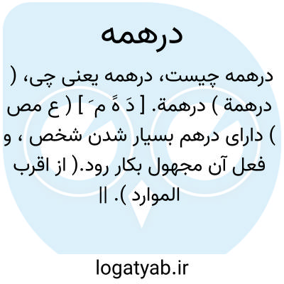 ( درهمة ) درهمة. [ دَ هََ م َ ] ( ع مص ) دارای درهم بسیار شدن شخص، و فعل آن مجهول بکار رود.( از اقرب الموارد ). || گردیدن برگ «خبازی » مانند درهم. ( از منتهی الارب ) ( از اقرب الموارد ).