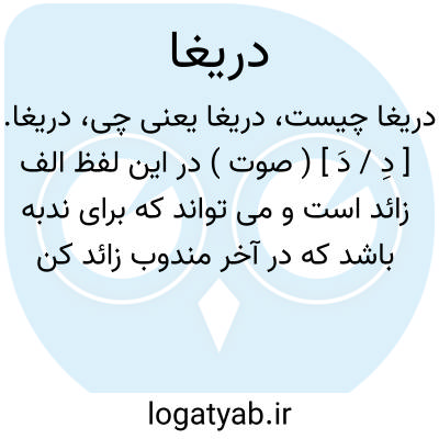 دریغا. [ دِ / دَ ] ( صوت ) در این لفظ الف زائد است و می تواند که برای ندبه باشد که در آخر مندوب زائد کنند برای مد صوت؛ و «خان آرزو» نوشته که الف دریغ رابط بود به معنی دریغ است، و همین قسم الف خوشا و بسا به معنی خوش است و بس است. ( غیاث ) ( آنندراج ). کلمه غیر موصول که در افسوس و حسرت استعمال کنند یعنی آه و وای و دردا و حیف و افسوس. ( ناظم الاطباء ). ای دریغ و افسوس کردن بر تقصیرات گذشته. ( شرفنامه منیری ). افسوس. ای افسوس. حیف. حیف باد. وا اسفا. دردا. حسرتا. واحسرتا. وای. اسفا. فسوسا. والهفا. ایا. معالاسف. معالتأسف: