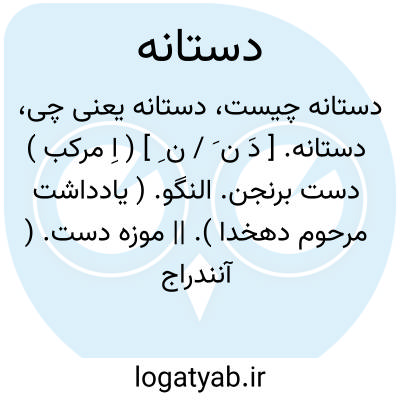 دستانه. [ دَ ن َ / ن ِ ] ( اِ مرکب ) دست برنجن. النگو. ( یادداشت مرحوم دهخدا ). || موزه دست. ( آنندراج ). دستکش. ( ناظم الاطباء ). چیزی است از پوست یا پشم که بجهت دفع اذیت سرما به دست پوشند.( لغت محلی شوشتر، نسخه خطی ). قولچاق. || چیزی است از پارچه که خبازان در وقت نان پختن پوشند. پارچه ای است که نانوایان در وقت نان پختن به دست کشند. ( لغت محلی شوشتر، نسخه خطی ). || تازیانه. || افزار کشتکاری. ( ناظم الاطباء ).