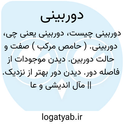 دوربینی. ( حامص مرکب ) صفت و حالت دوربین. دیدن موجودات از فاصله دور. دیدن دور بهتر از نزدیک. || مآل اندیشی و عاقبت اندیشی و بصیرت.( ناظم الاطباء ). صفت و حالت دوراندیش. دوراندیشی. آخربینی. تدبیر درکارها. ( یادداشت مؤلف ):