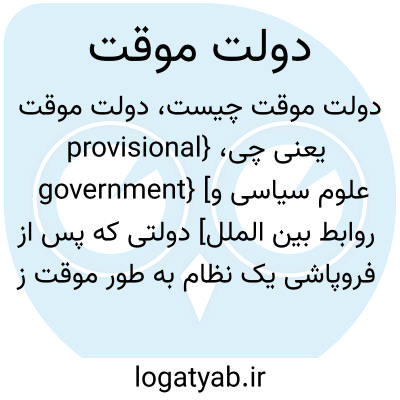 {provisional government} [علوم سیاسی و روابط بین الملل] دولتی که پس از فروپاشی یک نظام به طور موقت زمام امور را به دست می گیرد و مقدمات تشکیل و استقرار نظام جدید را فراهم می کند