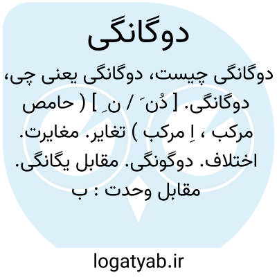 دوگانگی. [ دُن َ / ن ِ ] ( حامص مرکب، اِ مرکب ) تغایر. مغایرت. اختلاف. دوگونگی. مقابل یگانگی. مقابل وحدت: