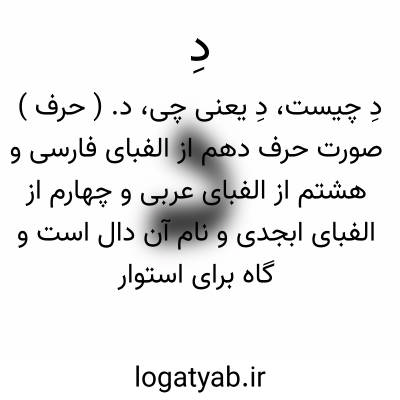 د. ( حرف ) صورت حرف دهم از الفبای فارسی و هشتم از الفبای عربی و چهارم از الفبای ابجدی و نام آن دال است و گاه برای استواری ِ ضبط، دال مهمله گویند. ( مقدمه برهان ). و آن از حروف ترابیه و نطعیه و قلقله و متشابهه و ملفوظی و شمسیه و مصمته و محقورة و مجزوم و ارضیه است و نیز از حروف خاکی است ( برهان در کلمه هفت حرف خاکی ) در حساب جُمَّل نماینده عدد چهارو در حساب ترتیبی نماینده عدد ده است. و در نجوم ومعماها علامت ستاره عُطارد است و مشبه به قد کمانی و در کتب لغت و جغرافیا رمز است از «بلد». و در علم نجوم و تقویم رمز و نشانه برج اسد است: