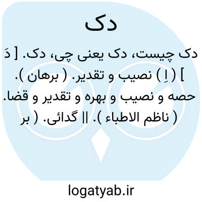 دک. [ دَ ] ( اِ ) نصیب و تقدیر. ( برهان ). حصه و نصیب و بهره و تقدیر و قضا. ( ناظم الاطباء ). || گدائی. ( برهان ). فقر و گدائی. ( ناظم الاطباء ). دق. و رجوع به دق شود. || گدا. ( برهان ). گدا و مفلس. ( ناظم الاطباء ):