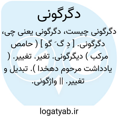 دگرگونی. [ دِ گ َ گو ] ( حامص مرکب ) دیگرگونی. تغیر. تغییر. ( یادداشت مرحوم دهخدا ). تبدیل و تغییر. || واژگونی. ( ناظم الاطباء ). || ( اصطلاح جانورشناسی ) دگردیسی. ( از دایرةالمعارف فارسی ). رجوع به دگردیسی شود.