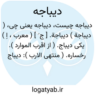 ( اسم ) ۱ - واحد دیباج. یا دیباجه روم دیبای رومی حریر رومی. ۲ - رومی چهره: آن دقوقی داشت خوش دبیاجه ای عاشق صاحب کرامت خواجه ای ( مثنوی نیک ۳ ص ۱۱٠ ). یا دیباجه کتاب ( تالیف ) مقدمه آن: [[ علی الفور دیباجه تالیفی در علم عروض و قوافی و فن و نقد اشعار تازی و فارسی آغاز نهادم ]] ( المعجم ).