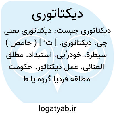 دیکتاتوری. [ ت ُ ] ( حامص ) سیطرة. خودرأیی. استبداد. مطلق العنانی. عمل دیکتاتور. حکومت مطلقه فردیا گروه یا طبقه بدون اینکه ملازم رضایت مردم باشد. این اصطلاح از دوره رومیها سابقه دارد. حکومتهای دیکتاتوری اعم از اینکه تحت اراده یک شخص یا گروه یا طبقه ( حزب، ارتش، پرولتاریا ) باشند، عملاً در دست یک شخص رهبر قرار دارد. یکی از انواع نوین حکومت دیکتاتوری رژیم توتالیته است که حکومتی دیکتاتوری و یک حزبی است، این اصطلاح بالاخص درمورد حکومت فاشیستی ایتالیا و حکومت نازی آلمان بکار رفته است. اصطلاح دیکتاتوری پرولتاریا که ساخته ل.ا. بلانکی است با پیدایش فلسفه سیاسی مارکسیسم رواج یافته است و به مرحله تحول جامعه از سرمایه داری به سوسیالیسم اطلاق میشود. ( از دائرة المعارف فارسی ).