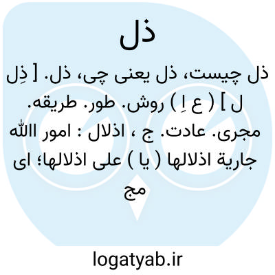 ذل. [ ذِل ل ] ( ع اِ ) روش. طور. طریقه. مجری. عادت. ج، اذلال: امور اﷲ جاریة اذلالها ( یا ) علی اذلالها؛ ای مجاریها. و جاء علی اذلاله؛ به روش و طور خویش آمد. دعه علی اذلاله؛ او را بر حال خود بمان. || ( ص ) اذلال ناس؛ مردم کم پایه. ( منتهی الارب ). || ( اِ ) ذِل طریق؛ میانه راه. || ( اِمص ) نرمی. ( مهذب الاسماء ). || مهربانی. || ( مص ) نرم و رام گردیدن. رام شدن. ( زوزنی ) ( دهار ) ( تاج المصادر بیهقی ). نرم شدن. || آسان شدن.