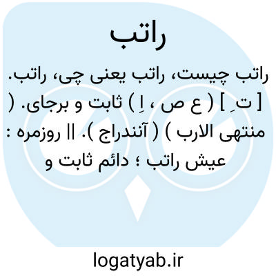 راتب. [ ت ِ ] ( ع ص، اِ ) ثابت و برجای. ( منتهی الارب ) ( آنندراج ). || روزمره: عیش راتب؛ دائم ثابت و الراتب عند المحدثین: ما یقدم مکافاة لمن هو فی منصب او خدمة؛ یعنی راتب در نزد محدثین آن چیزی است که بکسی که دارای منصبی است یا خدمتی انجام میدهد تقدیم شود. ج، رواتب. ( از المنجد ):