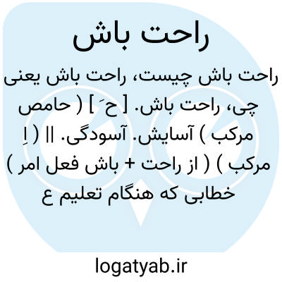 راحت باش. [ ح َ ] ( حامص مرکب ) آسایش. آسودگی. || ( اِ مرکب ) ( از راحت + باش فعل امر ) خطابی که هنگام تعلیم عملیات نظامی و ورزشی سربازان را دهند تا دم زنند و اندک راحتی یابند.