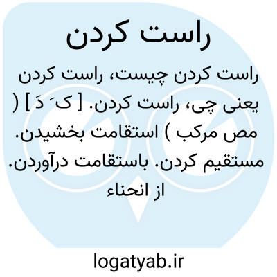 ( مصدر ) ۱ - مستقیم کردن ( چیزی را ) تقویم. ۲ - درست انجام دادن: [[ صدق در لغت راست گفتن و راست کردن و عده باشد ]] ( اوصاف الاشراف ۳. ) ۱۲ - ترمیم کردن: [[ بوبکر بفرمود تا راست کردند ]] ( باره شهر را ]] ( تاریخ سیستان ۴. ) ۳۵۵ - هموار کردن ( خاک زمین ). ۵ - ژماره کردن کسی برای مباشرت او بلند کردن: مدتی بود تا که گای نداشت پسری راست کرد و جای نداشت ( حدیقه ۶. ) ۶۶۸- حاضر کردن مهیا ساختن. ۷- مقابله کردن ( کتاب و مانند آن ).