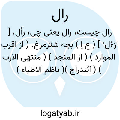 رأل. [ رَءْل ْ ] ( ع اِ ) بچه شترمرغ. ( از اقرب الموارد ) ( از المنجد ) ( منتهی الارب ) ( آنندراج )( ناظم الاطباء ) ( مهذب الاسماء ) ( دهار ). بچه یک ساله شترمرغ. ( از اقرب الموارد ) ( از منتهی الارب ) ( از آنندراج ) ( ناظم الاطباء ). ج، اَرْوال، رِئلان، رِئالة، رِئال. ( المنجد ) ( اقرب الموارد ) ( منتهی الارب ) ( آنندراج )( ناظم الاطباء ). و رئال مشهورتر است. || خَوّدَ رأله، فزع؛ یعنی ترسید، «اقول لنفسی حین خود رألها»؛ به نفس خویش می گویم هنگامی که بترسد. || زف رأل القوم؛ هلکوا. ( از اقرب الموارد ).